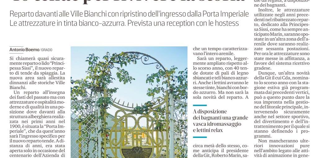 A Grado Lido “Principessa Sissi” sarà la nuova spiaggia allestita davanti alle storiche Ville Bianchi: un’ area attrezzata con 40 tende, vasca idromassaggio e lettini relax. La “Porta Imperiale” dove un tempo vi accedeva la nobiltà mitteleuropea diventerà l’ingresso principale del nuovo reparto tende che rievocherà il fasti del passato con un tocco di modernità. CLICCA QUI per leggere l’articolo completo.